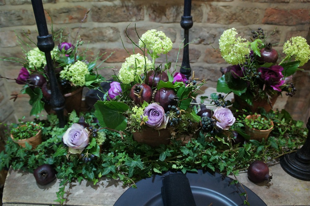 A wooden table was dressed using vintage terracotta flowerpots filled with gorgeous flowers, fruits and foliages. Black chargers with linen napkins are used as a place setting and iron candlesticks with black candles are placed informally on the table. Ivy trails linking all the elements together. In the detail for the fresh elements you can … Read moreA Beautiful Table Setting